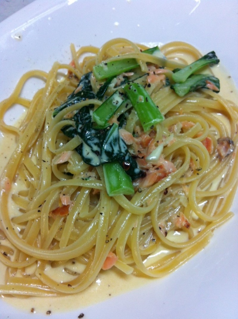 今日のメニューは「スモークサーモンのクリームパスタ」