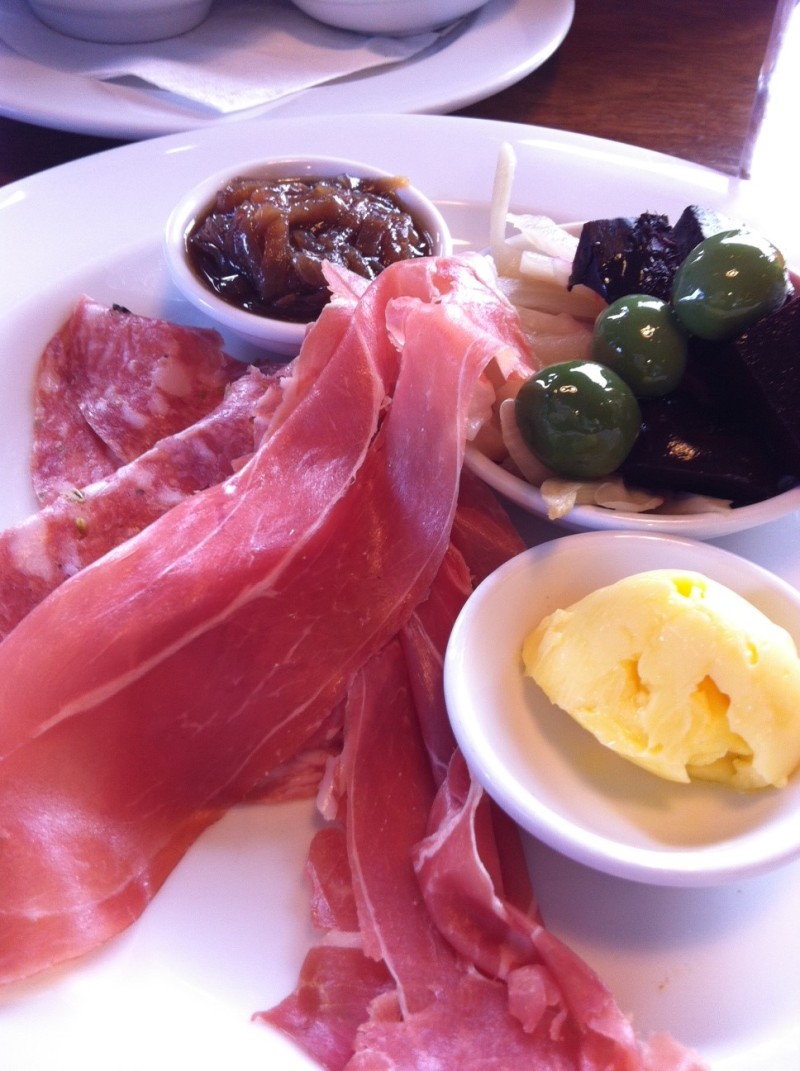 そして、テーブルにハムとパンの盛り合わせをもらいました。