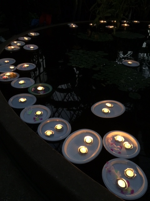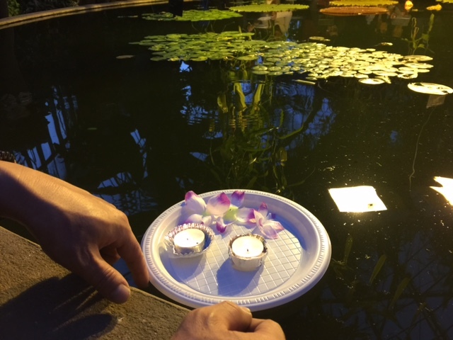池に浮かぶキャンドルを見て、